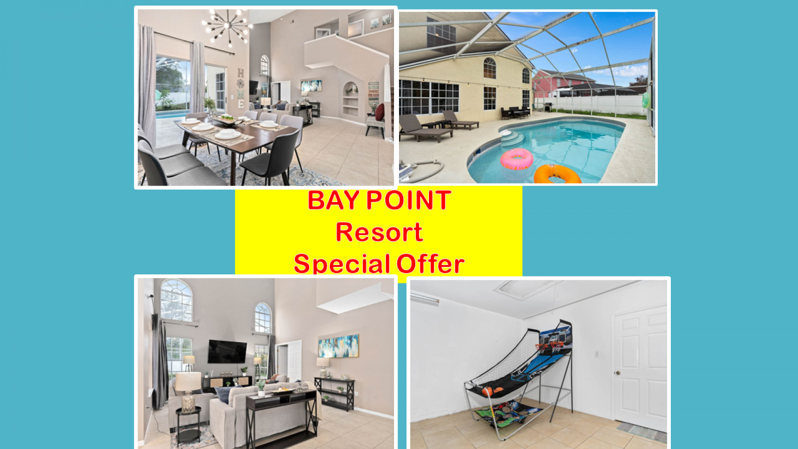 Amenities: Private south-facing pool, air-conditioned game room, flat-screen TVs, fast Wi-Fi, air conditioning & heating, free on-site washer and dryer, free driveway parking for 2 cars