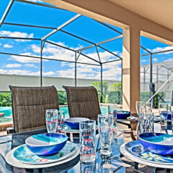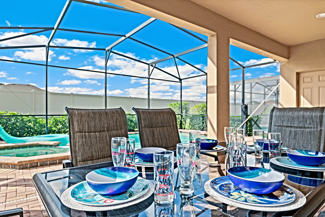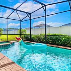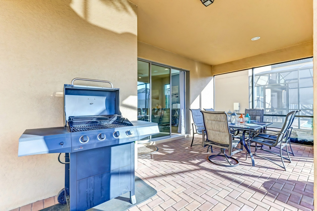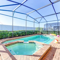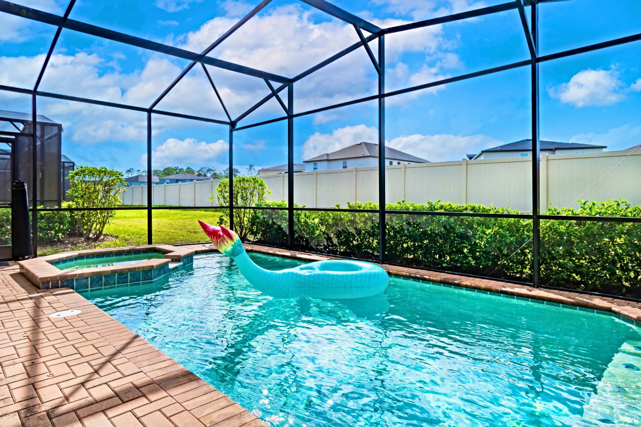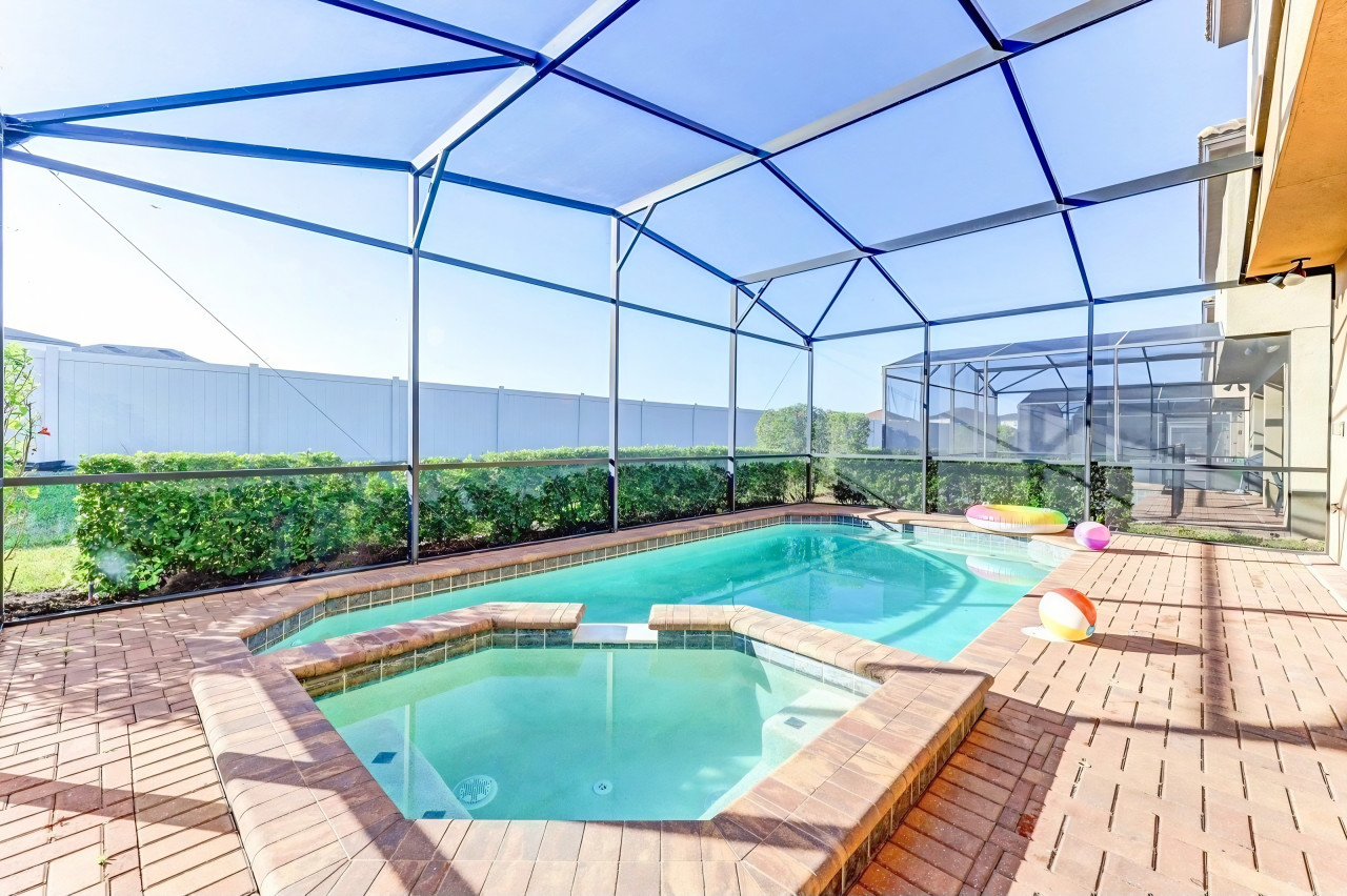 Private west-facing pool, jacuzzi, screened lanai with BBQ, and lounge chairs. Enjoy sunset views 🌅, pool toys, and yard games 🎲.