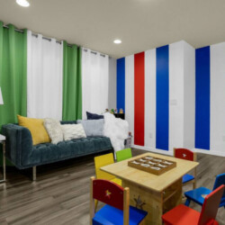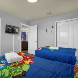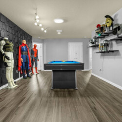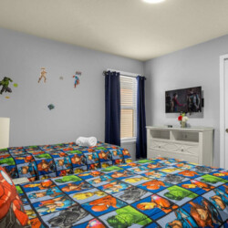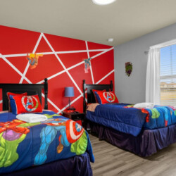 Each bedroom is designed to fit the home’s Avengers theme with professionally selected colors, artwork, and bedding. You’ll notice Iron Man, Captain America, Thor, Hulk, Spiderman, Doctor Strange, and Captain Marvel themes throughout! All rooms have soft linens, carefully curated themed decor, smart TVs, easy Access to bathrooms, and ample storage space.
