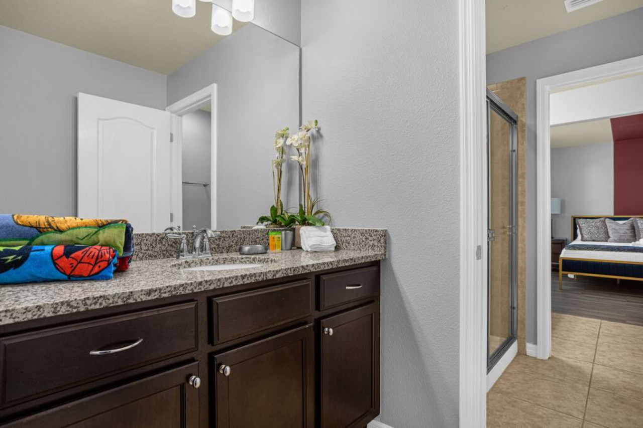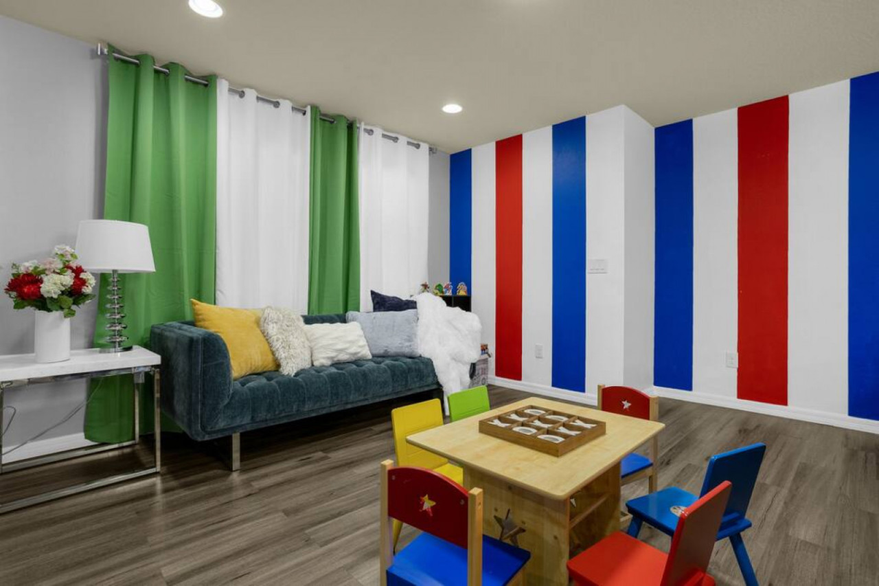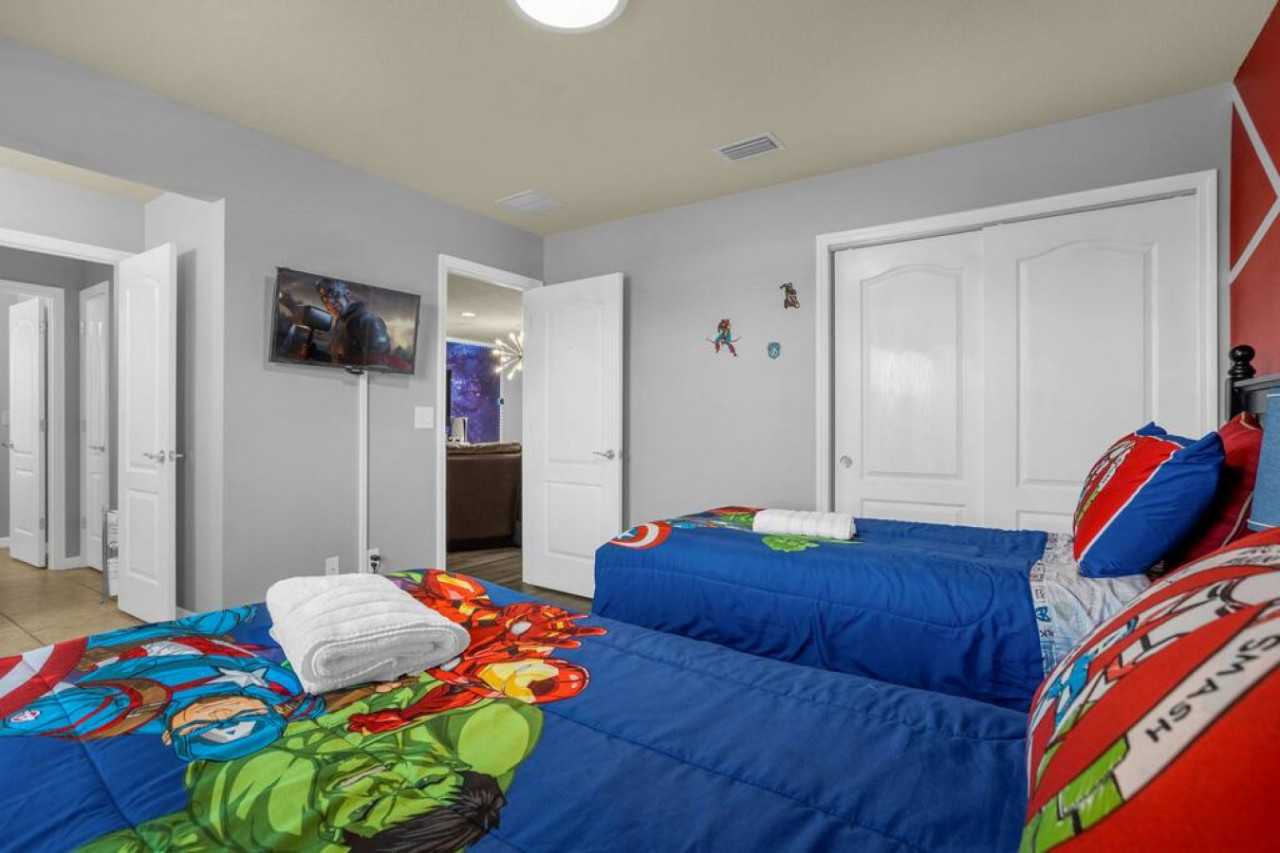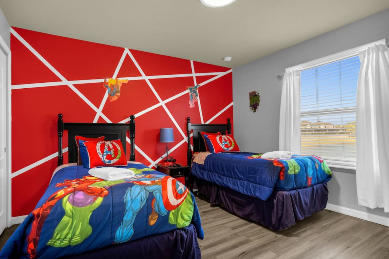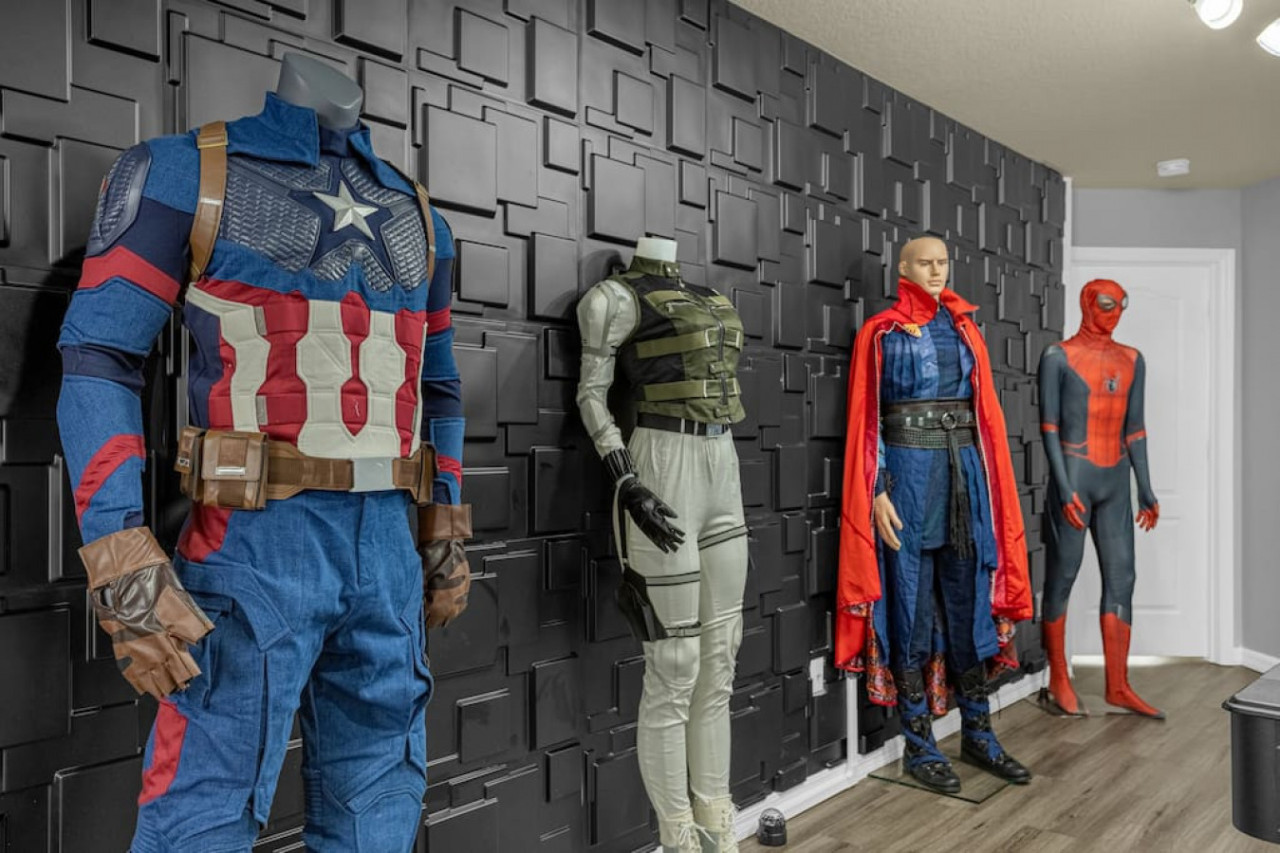Each bedroom is designed to fit the home’s Avengers theme with professionally selected colors, artwork, and bedding. You’ll notice Iron Man, Captain America, Thor, Hulk, Spiderman, Doctor Strange, and Captain Marvel themes throughout! All rooms have soft linens, carefully curated themed decor, smart TVs, easy Access to bathrooms, and ample storage space.