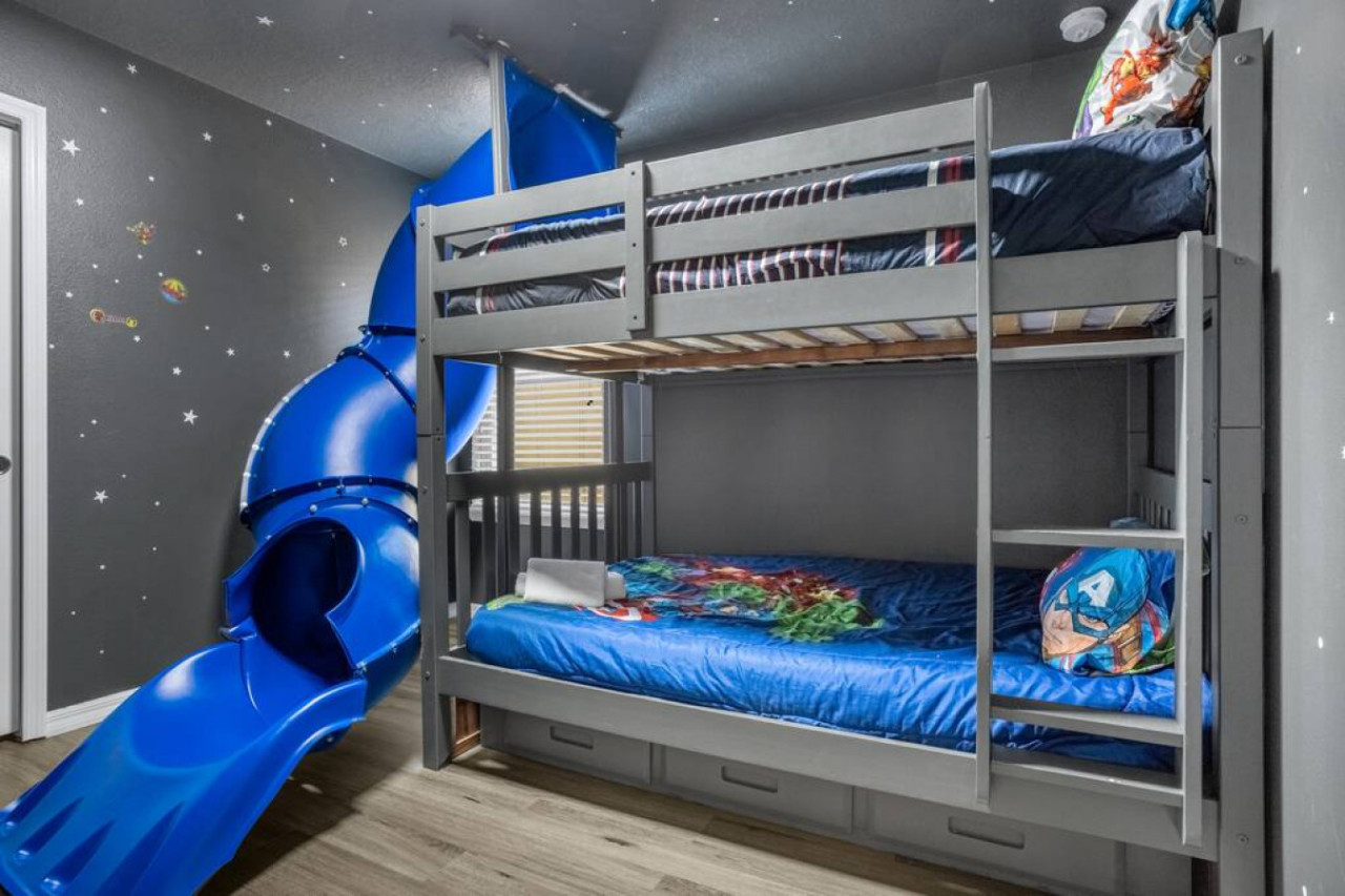 Bedrooms one to five feature four king-sized beds and one queen-sized bed that ensure couples enjoy privacy and comfort during their time away. Bedroom six is a large bedroom fitted with two queen-sized beds. Bedrooms seven and eight have twin beds with matching avengers bedding, perfect for the kids. Bedroom nine is the kid’s favorite featuring an awesome bunk bed with a slide down from the top bunk, a truly unique feature to remember for years to come.
